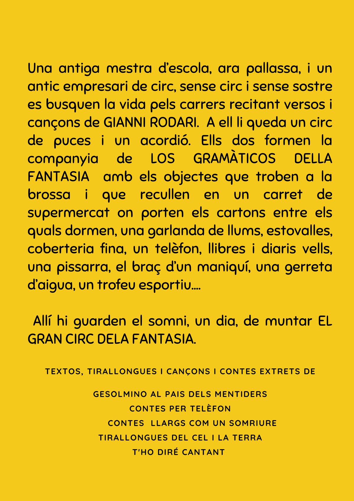 Del Rodari silenciat per editors i per mestres ens queda la seva obra escrita per ser compartida a classe i a casa, per a ser llegida (fins i tot cantada) en veu alta per petits i grans. La seva obra, de vegades trista, de vegades hilarant, sempre social, una deliciosa joguina escènica, és un viatge lluminós a la fantasia més loquaç, més pura, més dislocada, una reivindicació necessària en un món cada dia més fosc i escassament inspirador.