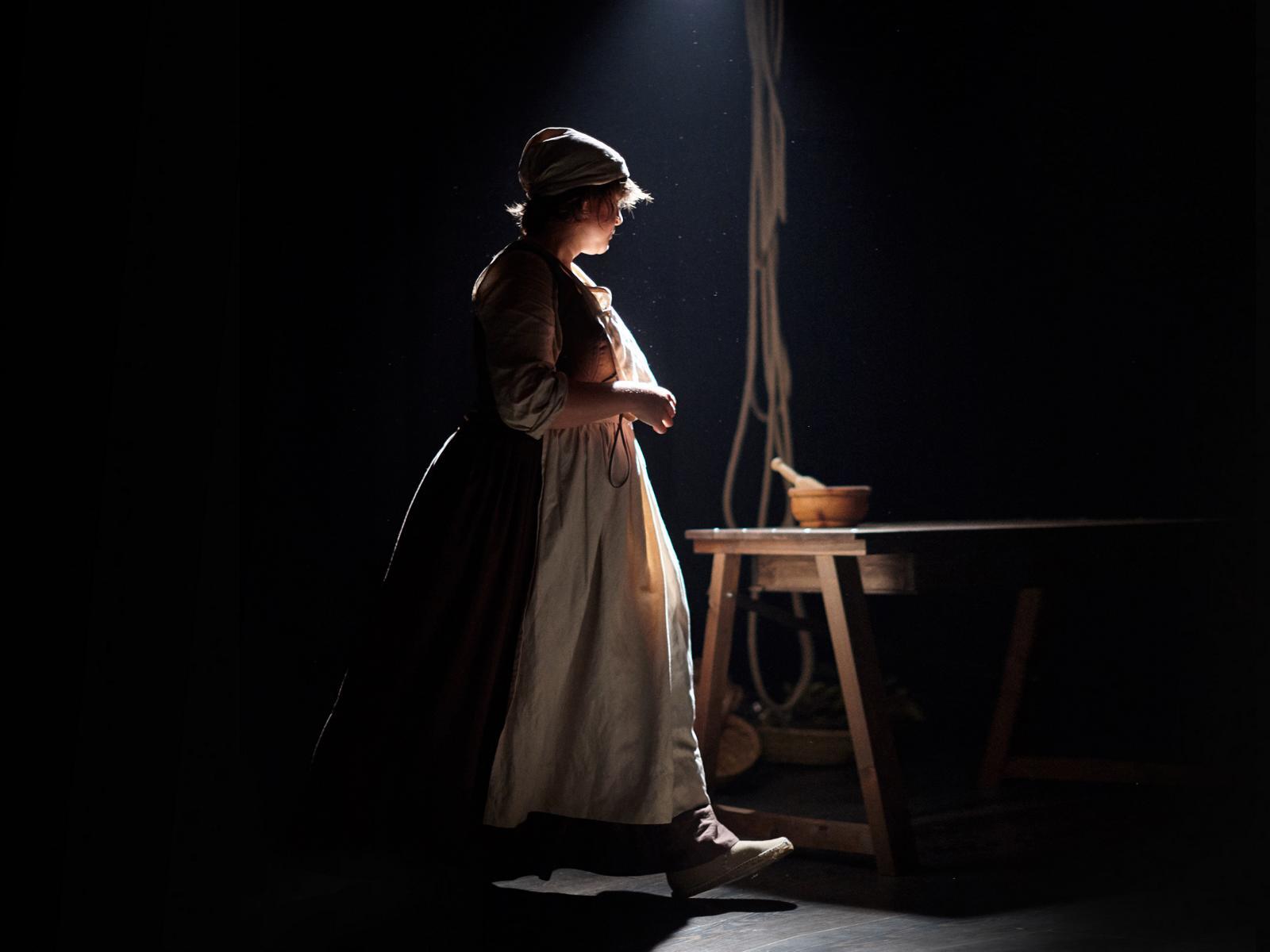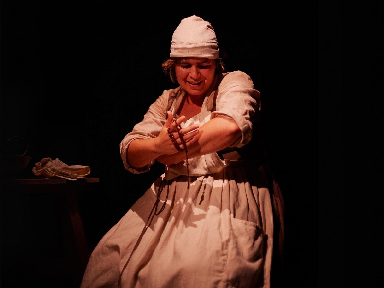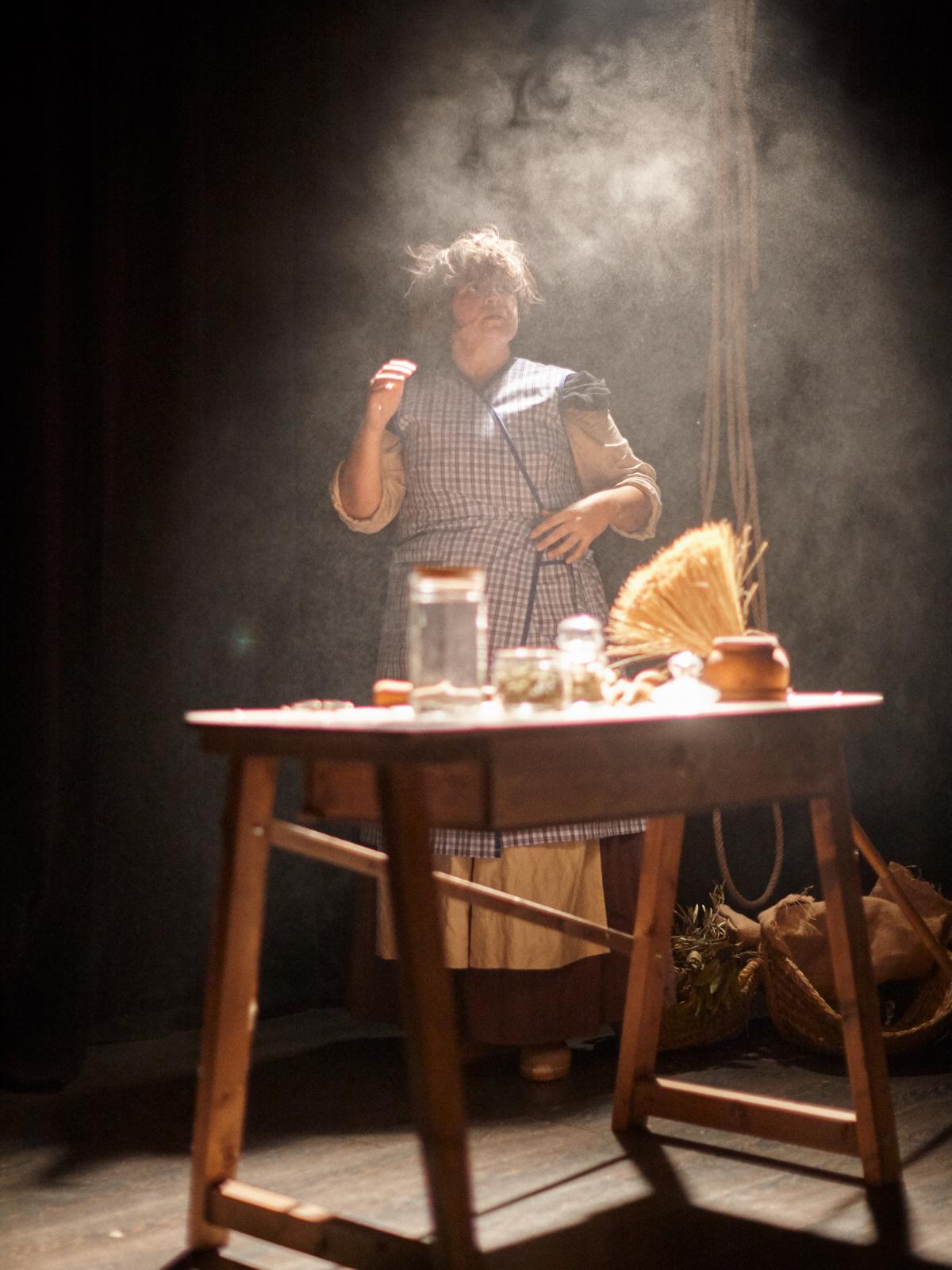 L'espectacle el posa en escena una sola actriu, però no es pot dir que sigui un monòleg, perquè l'actriu transita d'un personatge a l'altre, construeix escenes dialogades i, de tant en tant, l'acció s'intensifica fins a esdevenir frenètica. Petits canvis de vestuari, un davantal, un barret, un pentinat, el cos, la veu, una forma de parlar, tot serveix per a pintar un personatge o l'altre. Tot i la essencialitat de la posada en escena, hi ha un intent de realisme, gairebé costumisme, en la forma del vestir, en els objectes, fins i tot en el parlar que dóna a l'espectacle un aire una mica antic. Però aquest llenguatge es trenca sobtadament amb una explosió d'acció que és un dels moments més potents de la peça. Són uns pocs minuts de bogeria, però l'energia es desborda de cop i volta i de l'escenari emergeix una tempesta d'imatges gairebé de malson tot reproduint escenes d'un aquelarre meravellosament ben dibuixades.