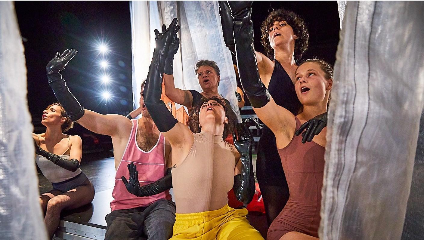 Un cartel de “Lux Perpetua” anuncia la apertura al ritual al que se nos invita, con música en directo, genialmente orquestada por Aurora Bauzà i Pere Jou, acompañando y acentuando el dramatismo de la obra para llevarnos del cielo al inframundo de ida y vuelta. La presencia de 9 maravillos@s y variopint@s intérpretes, se explaya en una especie de escena metateatral, basada en imágenes del casting real y las de la película All that jazz generando suspicazmente un diálogo entre el cine y el escenario: la ficción de la representación del momento y la vivencia literal por la que atravesaron unos meses antes de la creación del espectáculo, donde aparecen quienes aspiraban a entrar en el elenco, y los cuerpos de carne y hueso de l@s que hoy habitan la escena.