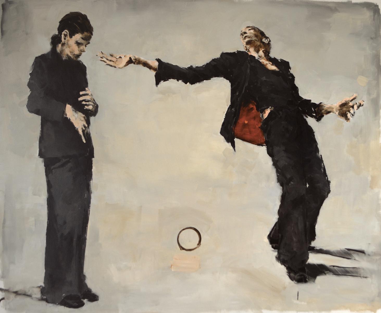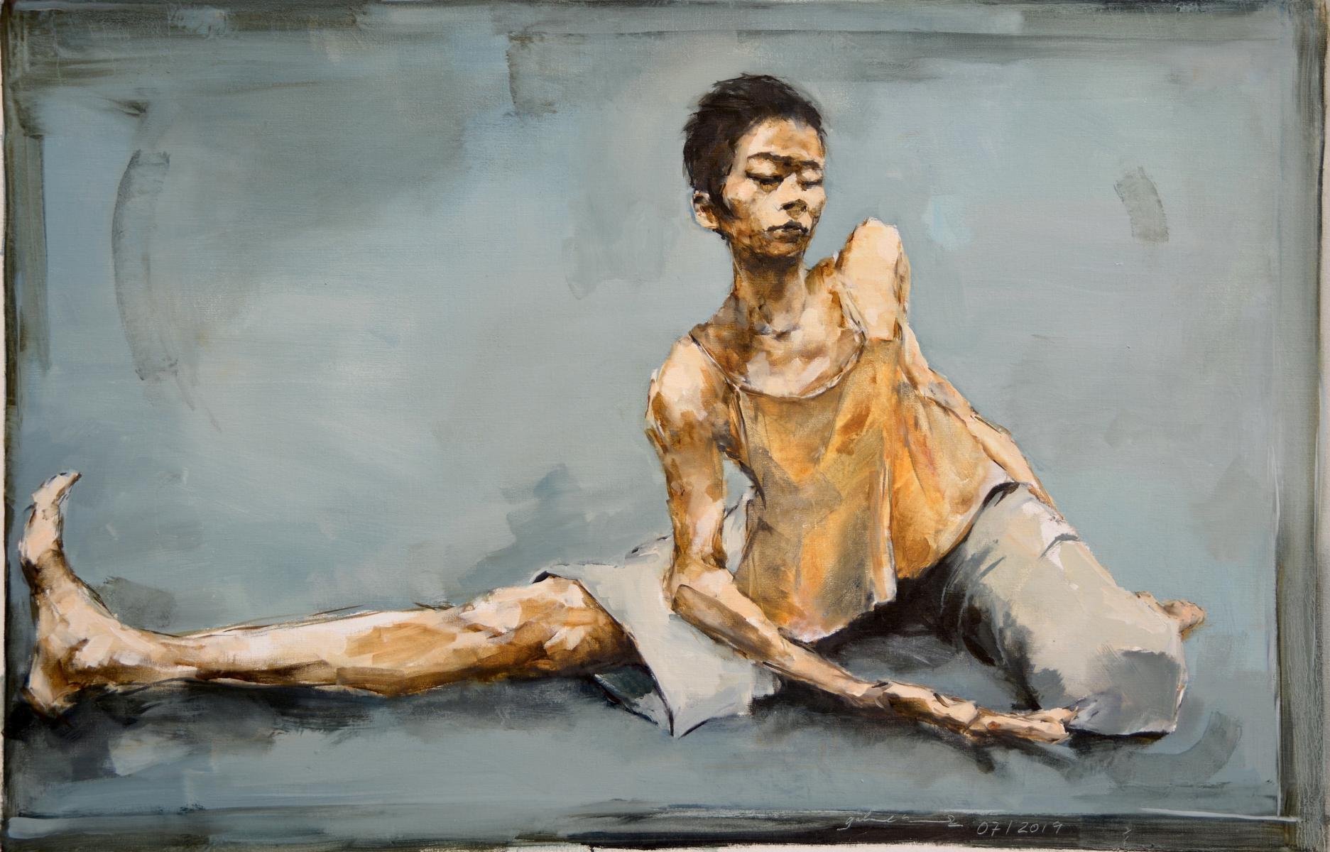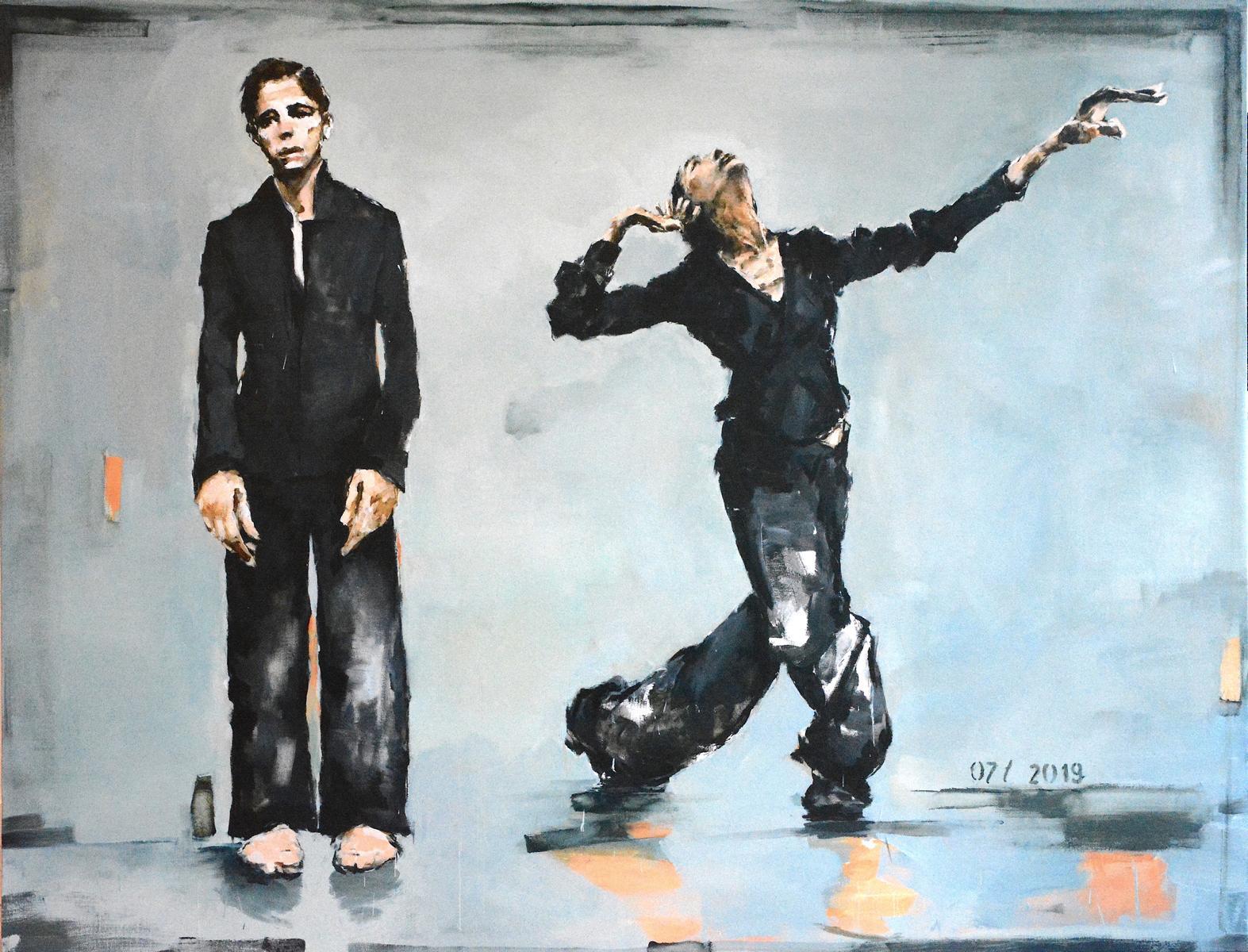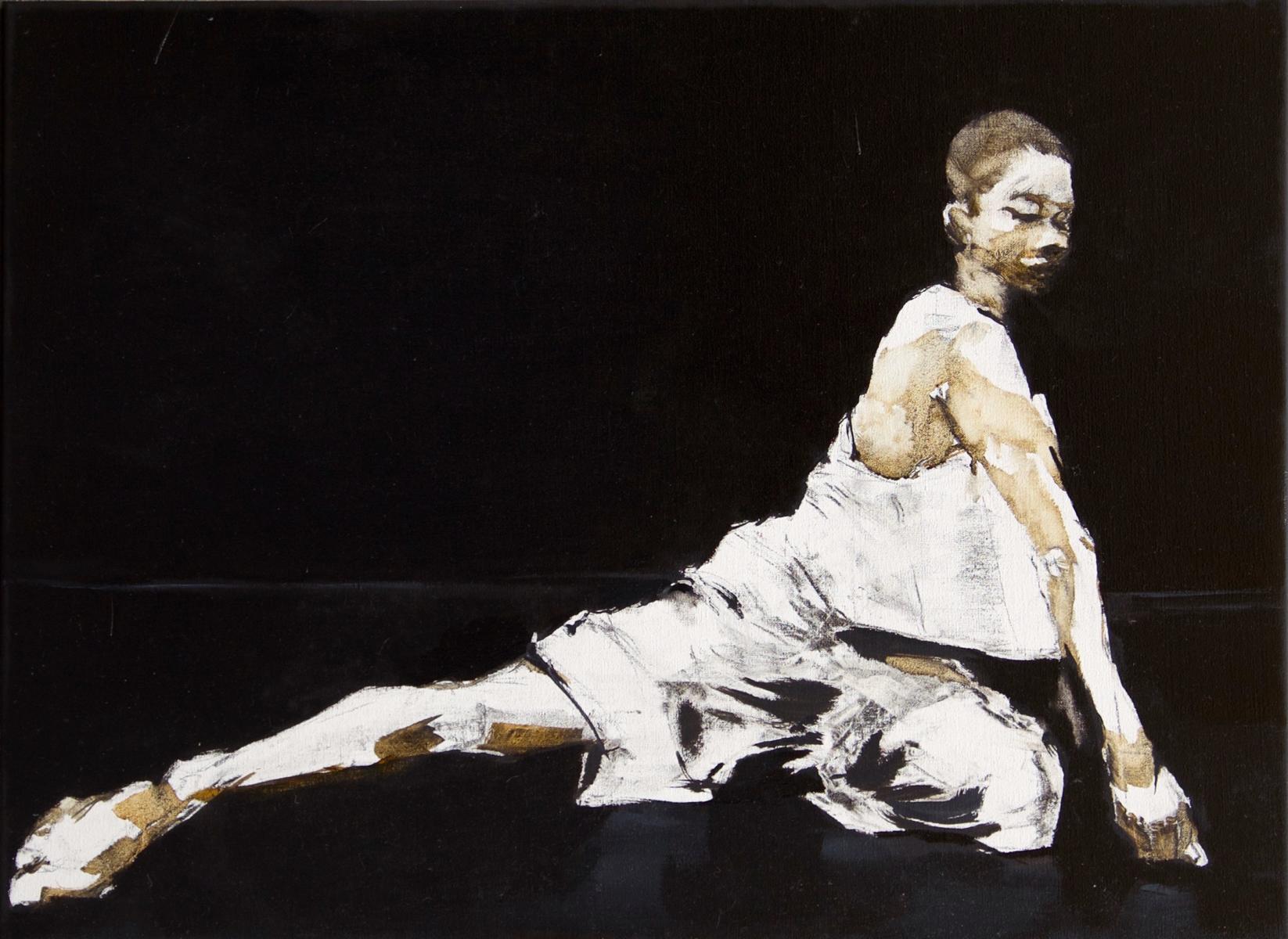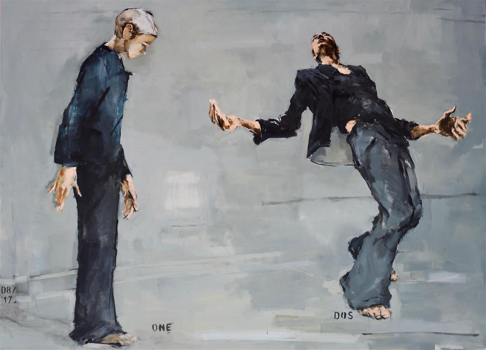 No obstant això, hi ha terreny en comú. La tela defineix un espai semblant a un escenari pel qual es mou el pinzell. Ritme i equilibri són igual de crucials en una composició que en una coreografia. El temps també està present, s'acumula en lloc de desplegar-se. Temps múltiple, el meu temps quan pinto, el temps pel qual es mou la ballarina (tal com he dit m'inspira l'altre, l'oposat, i sí, pinto gairebé sempre dones, el seu llenguatge físic em fascina i em exigeix buscar un equivalent al seu art en el meu treball) i finalment el temps de qui miri el quadre, tres corrents confluint en un sol lloc i moment.