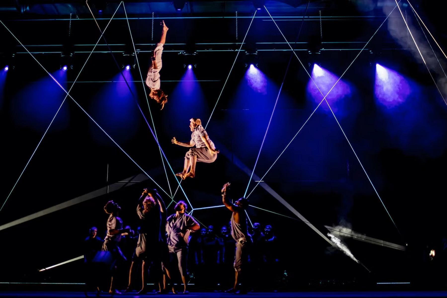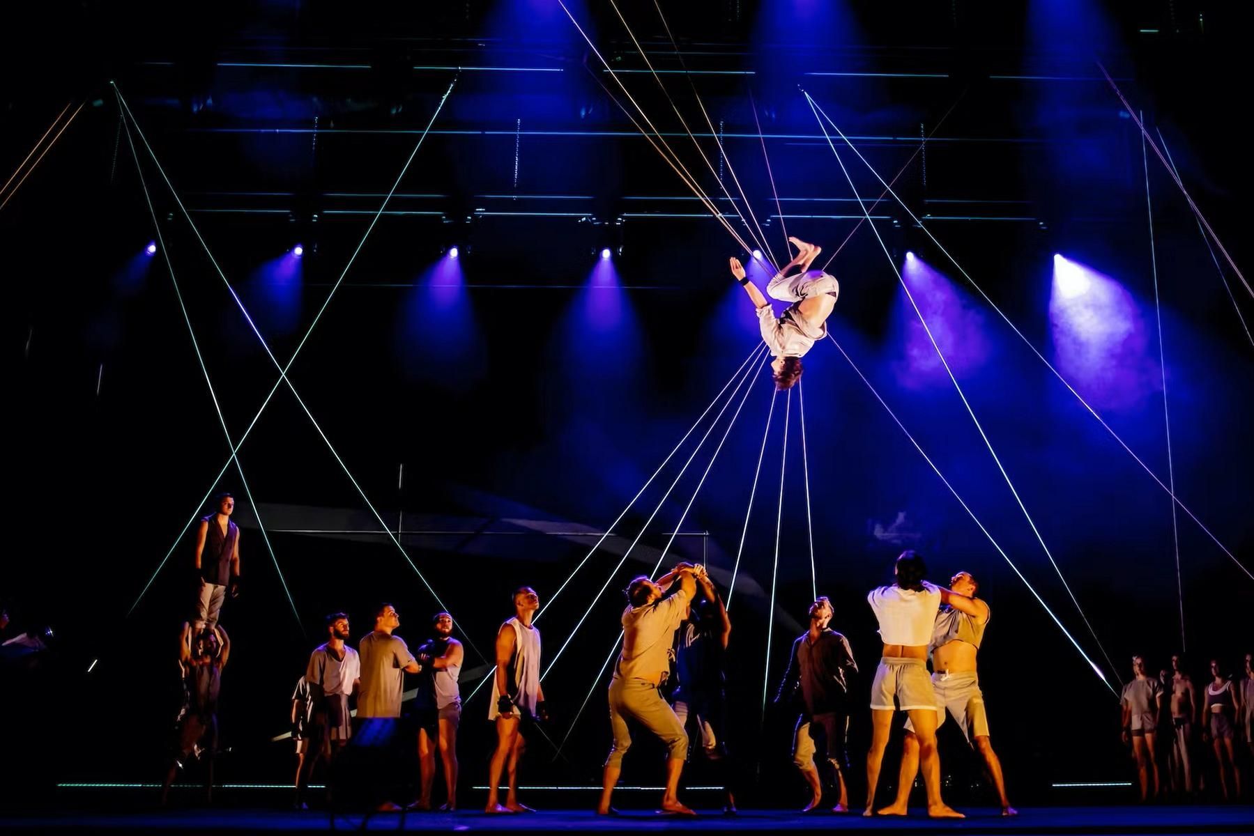 En un moment, tots els intèrprets trenquen la convenció de la mística abstracta a la qual havíem arribat. Mentre uns parlen, discuteixen i s'agrupen, d'altres surten de l'escenari, pugen per les escales i des d'unes bastides travessen tot el recinte amb unes cordes llarguíssimes que afegeixen línies geomètriques al joc escenogràfic i d'il·luminació. En una al·lusió al que seria l'esquelet d'una carpa de circ, ens connecten, a grada i escenari, dins de la mateixa configuració de traços que ens circumden.