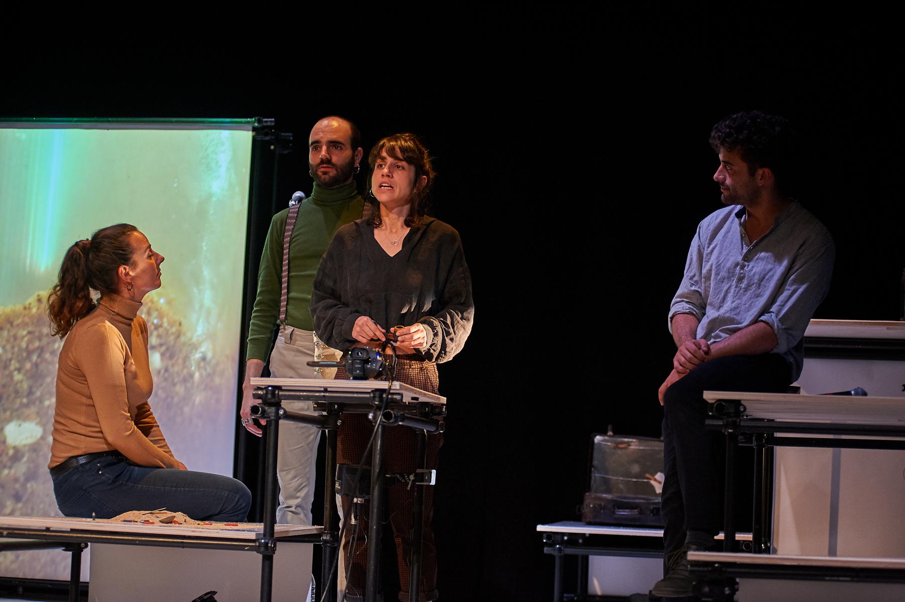 L'espectacle és un relat fet de pinzellades, de petites històries, de petits moments. Els quatre intèrprets –o, millor dit, performers– es prenen la paraula, ara són un o altre personatge, sense acabar de ser-ho mai. Canten cançons que ens remeten a l'època, que ens transporten un instant fins assenyalar un record, però no s'hi abonen. Generen imatges en moviment, de vegades molt poètiques, interactuant amb els objectes i les projeccions. Apareixen fotos d'època, però és només un recurs entre d'altres. Ni tan sols la nena que fa el viatge, que és la veritable protagonista del relat, és interpretada de forma continuada i naturalista per una de les actrius, sinó que va apareixent aquí i allà, sense que en cap ocasió la actriu deixi de ser ella mateixa.